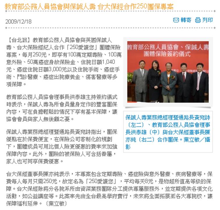 教育部公務人員協會與保誠人壽 台大保經合作250團保專案