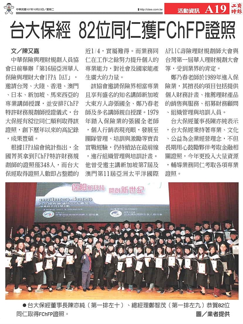 台大保經 82位同仁獲FChFP證照