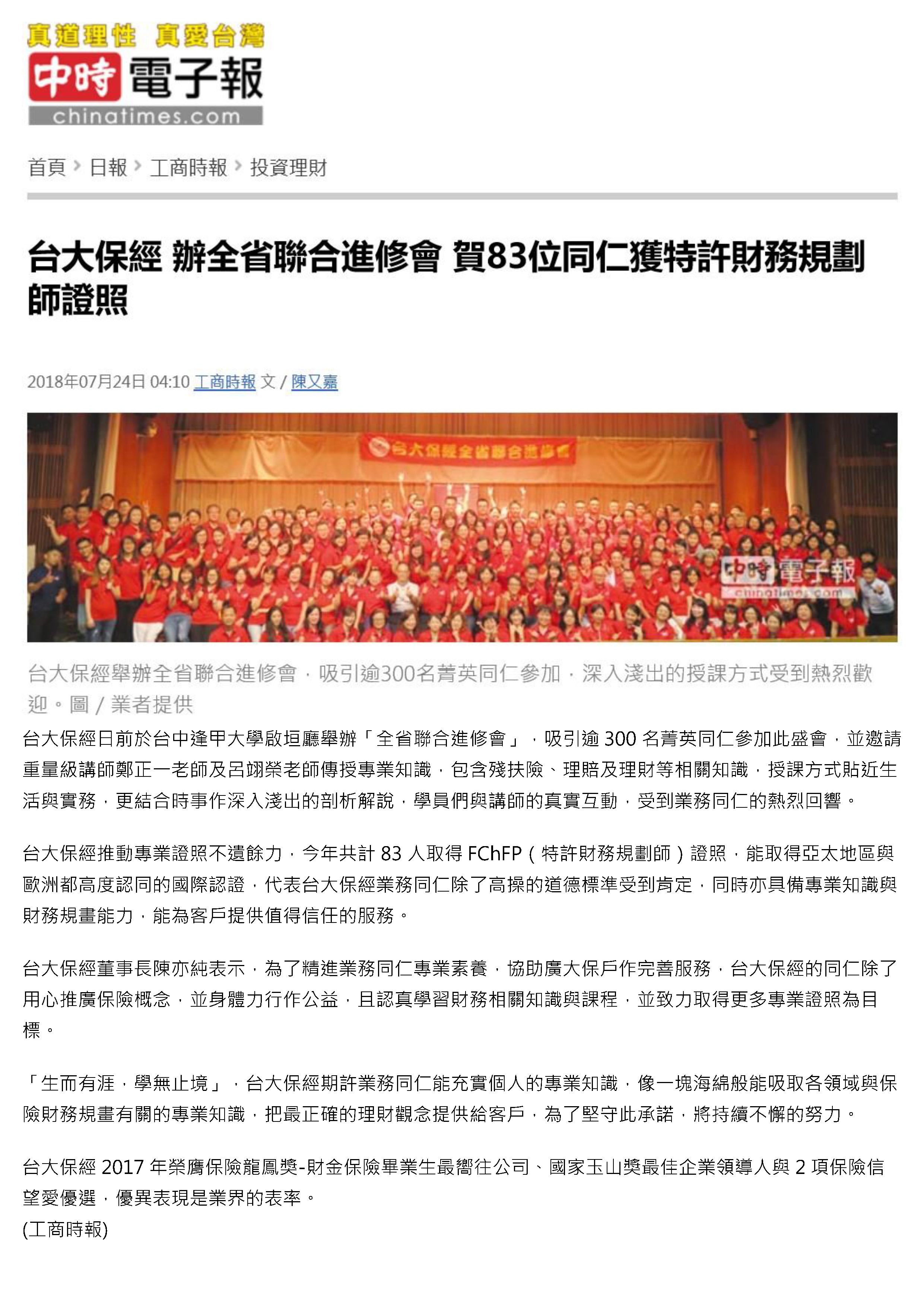 台大保經 辦全省聯合進修會 賀83位同仁獲特許財務規劃師證照